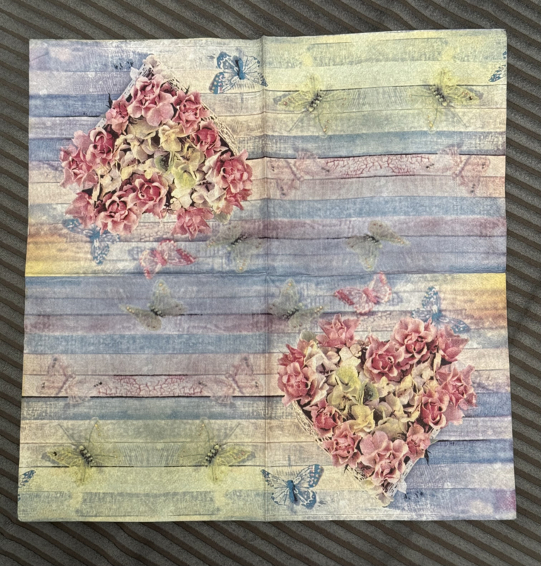 Bloemen in hart op hout print met vlinders servet (33x33 cm open gevouwen ) .Te gebruiken voor decoupage .2x2 afb.
