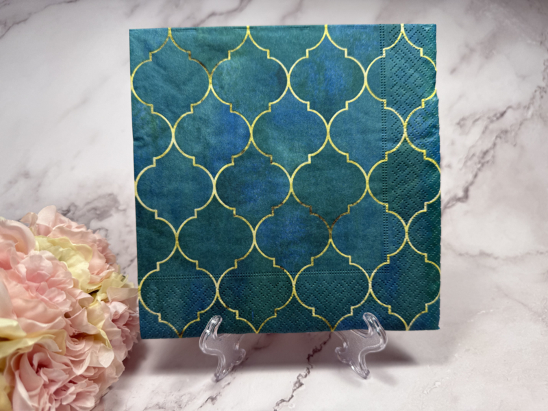 Blauw groen en goud motieven servet (33x33 cm open gevouwen ) .Te gebruiken voor decoupage .