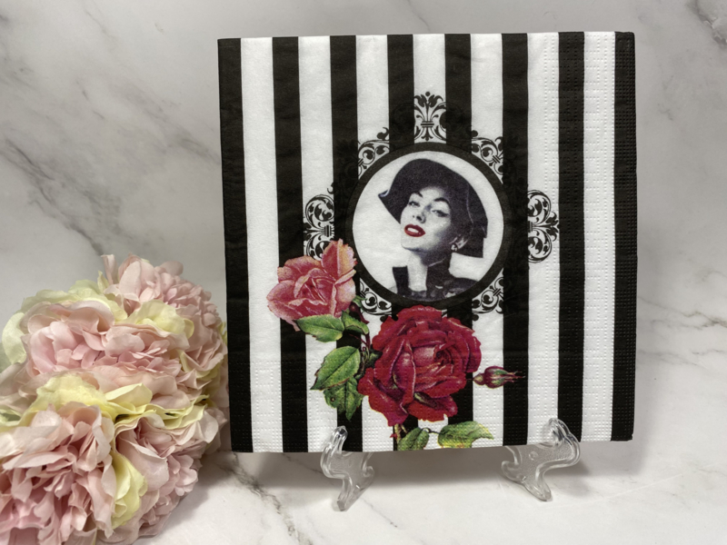 Zwart wit gestreept met frame en bloemen servet (33x33 cm open gevouwen ).Te gebruiken voor decoupage .