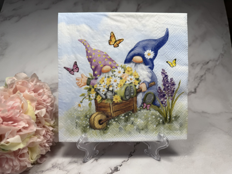 Gnomes en kruiwagen in tuin servet (33x33 cm open gevouwen ).Te gebruiken voor decoupage .