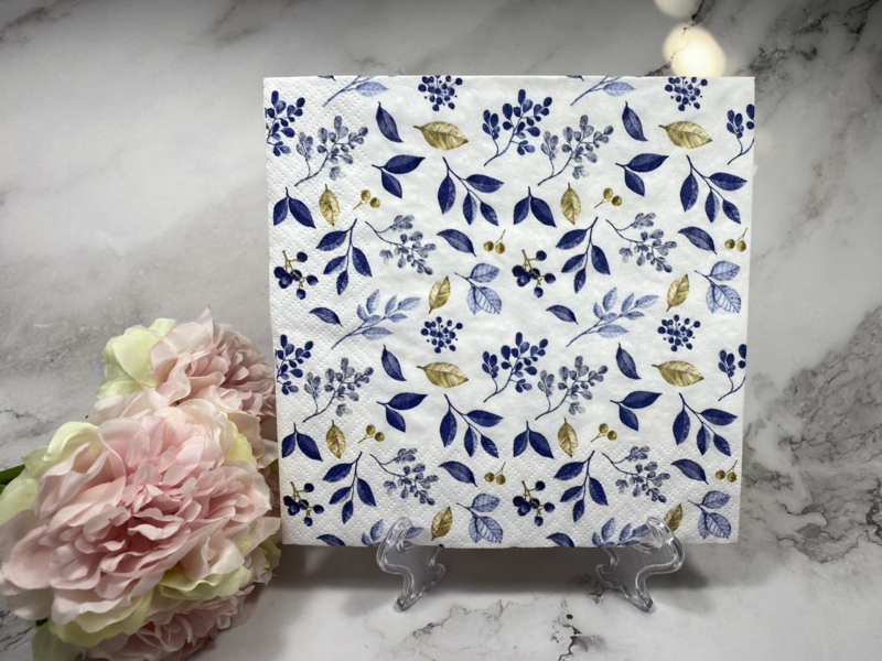 Winter blaadjes blauw goud servet (33x33 cm open gevouwen ) .Te gebruiken voor decoupage .